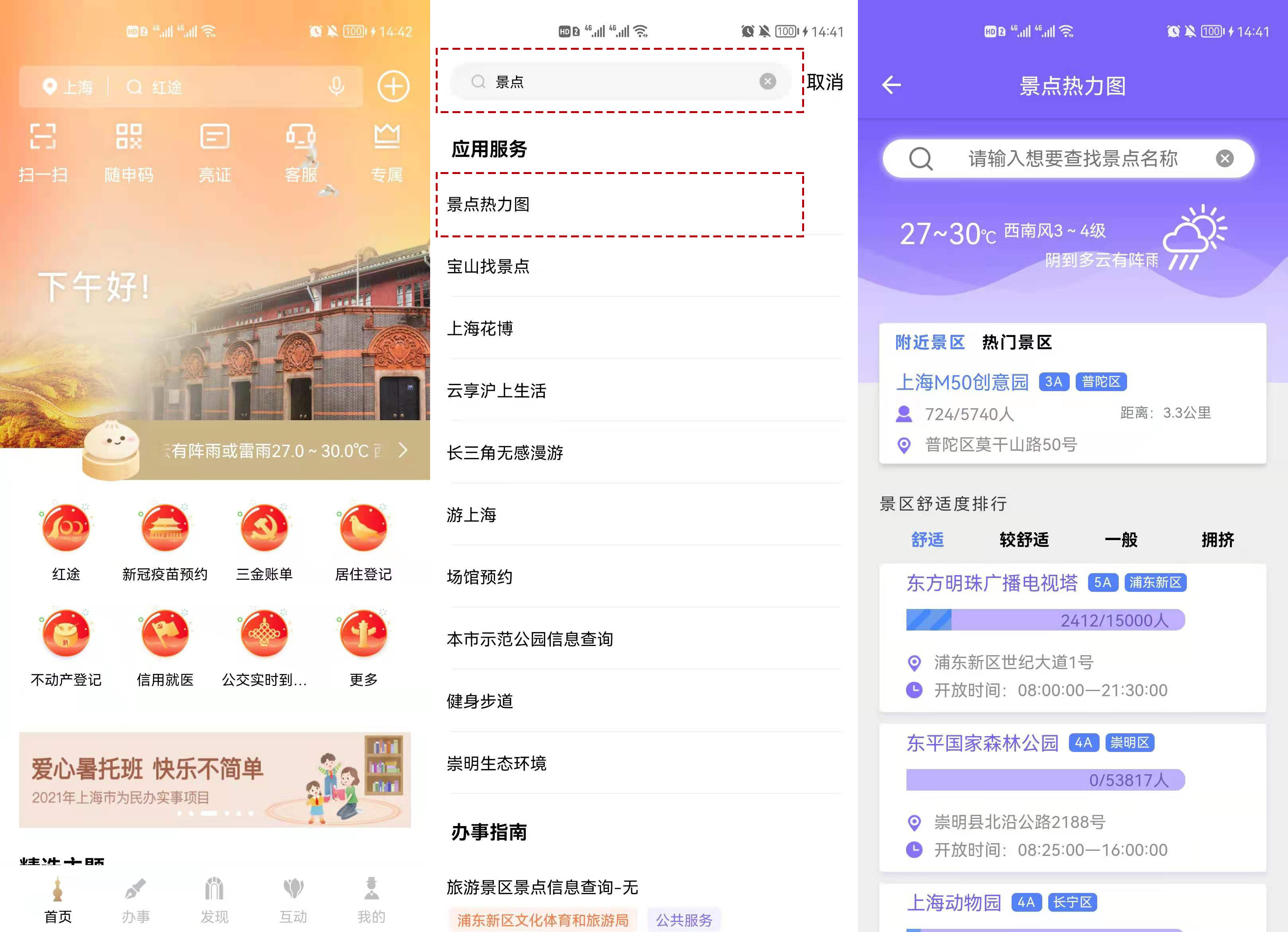 景點(diǎn)預(yù)約完成,出行前再同步使用“隨申辦市民云”APP的“景點(diǎn)熱力圖”服務(wù),還可查詢到景點(diǎn)實(shí)時(shí)客流量情況,有效避開人流高峰,助你提前了解地面交通狀況,合理規(guī)劃旅游線路和時(shí)間!