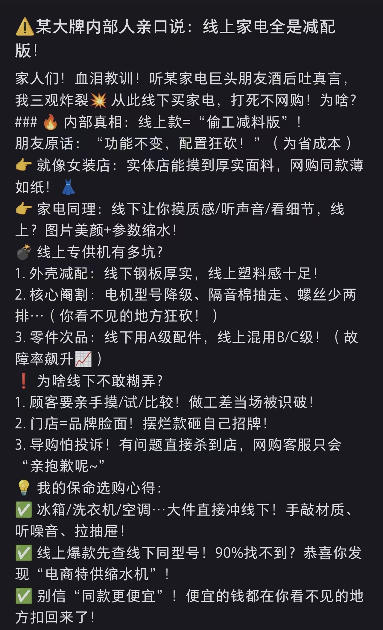例如,一些主打電商平臺的家電產(chǎn)品,即所謂的「電商款產(chǎn)品」,在一些功能和技術(shù)上相比同類型線下款的確是有些「配置縮水」,但價(jià)格也實(shí)打?qū)嵉乇染€下款低不少,同時(shí)在產(chǎn)品配置參數(shù)和商品信息頁面也都有呈現(xiàn),這就不屬于「欺詐」。