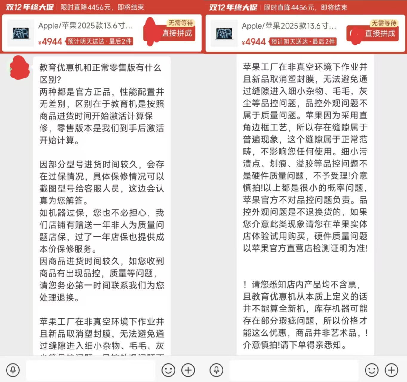 這種就屬于比較惡劣的行為了。小雷遇到的所謂「教育優(yōu)惠機(jī)」M4 MacBook Air, 在前臺被「包裝」成與普通零售機(jī)型無異,只有到了客服環(huán)節(jié)才給告知。