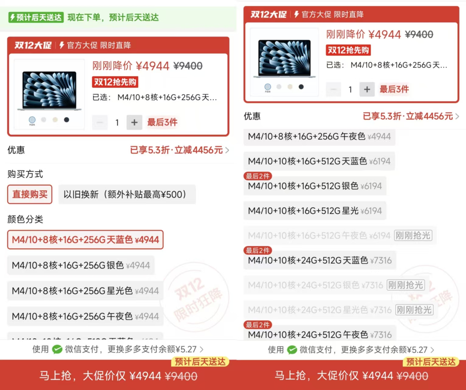 點(diǎn)進(jìn)去之后,實(shí)際下單頁面,M4 MacBook Air 入門款(16+256GB)價(jià)格的確如上所示,只要 4900 多元,16+512GB 版本只要 6100 多元,24+512GB 版本只要 7300 多元,均比百億補(bǔ)貼價(jià)格還要再低幾百塊。