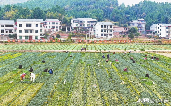 12月3日,湖南省永州市新田縣中山街道崗上村,村民在采收新鮮時蔬。近年來,該縣充分發(fā)揮富硒土地優(yōu)勢,積極對接粵港澳大灣區(qū)蔬菜市場,采用“稻+蔬”輪作模式,大力發(fā)展冬季蔬菜種植產(chǎn)業(yè),實現(xiàn)一年四季無閑田,有效帶動農(nóng)業(yè)增效、農(nóng)民增收。劉貴雄 攝