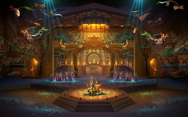 2019年立項(xiàng),2023年《樂動(dòng)敦煌》上演。總導(dǎo)演張華告訴記者:“編創(chuàng)團(tuán)隊(duì)做了很多功課。從莫高窟壁畫中找到創(chuàng)作靈感,通過(guò)對(duì)壁畫內(nèi)容的解讀,借助敦煌數(shù)字化研究成果做了生動(dòng)的活態(tài)化轉(zhuǎn)化。劇場(chǎng)從藏經(jīng)洞開始,觀眾穿梭于不同洞窟,看到怒目金剛、美人菩薩、飛紗飛天等。這些原本存在于壁畫中的形象在身邊一一‘活’了起來(lái),既保留了敦煌的文化特色,又成就了這部作品獨(dú)特的魅力神韻?!?/p>