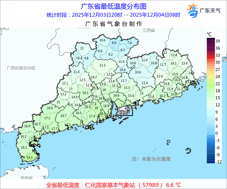 6日,全省大部晴到多云。最低氣溫:粵北、珠三角北部市縣7~10℃,雷州半島15~18℃,其余市縣11~14℃。