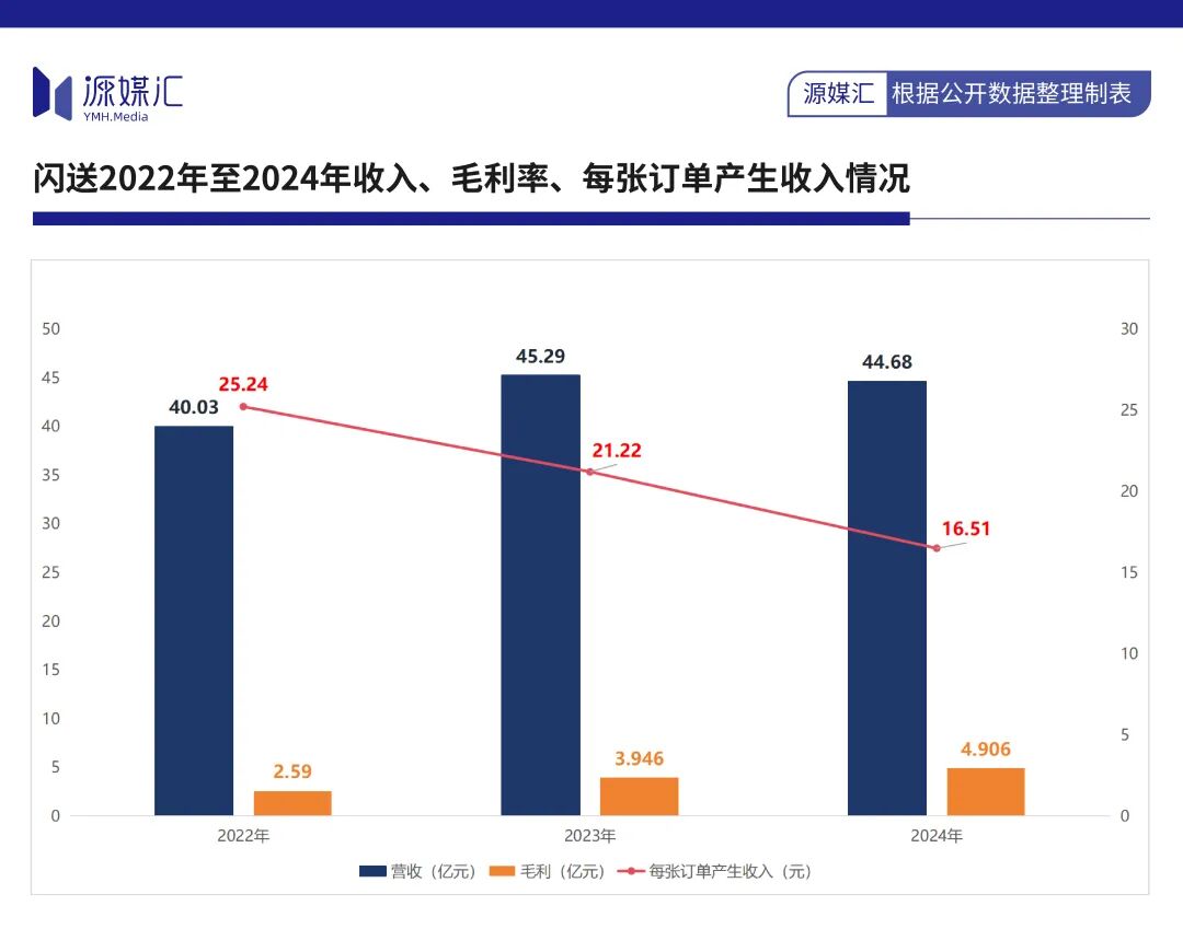 2022年至2024年,閃送的營收分別為40億元、45.3億元和44.7億元;毛利呈現(xiàn)上升趨勢,從2.6億元增至4.9億元。毛利率從6.48%上升至約11%。期內(nèi),閃送分別完成訂單約1.586億單、2.134億單和2.707億單。