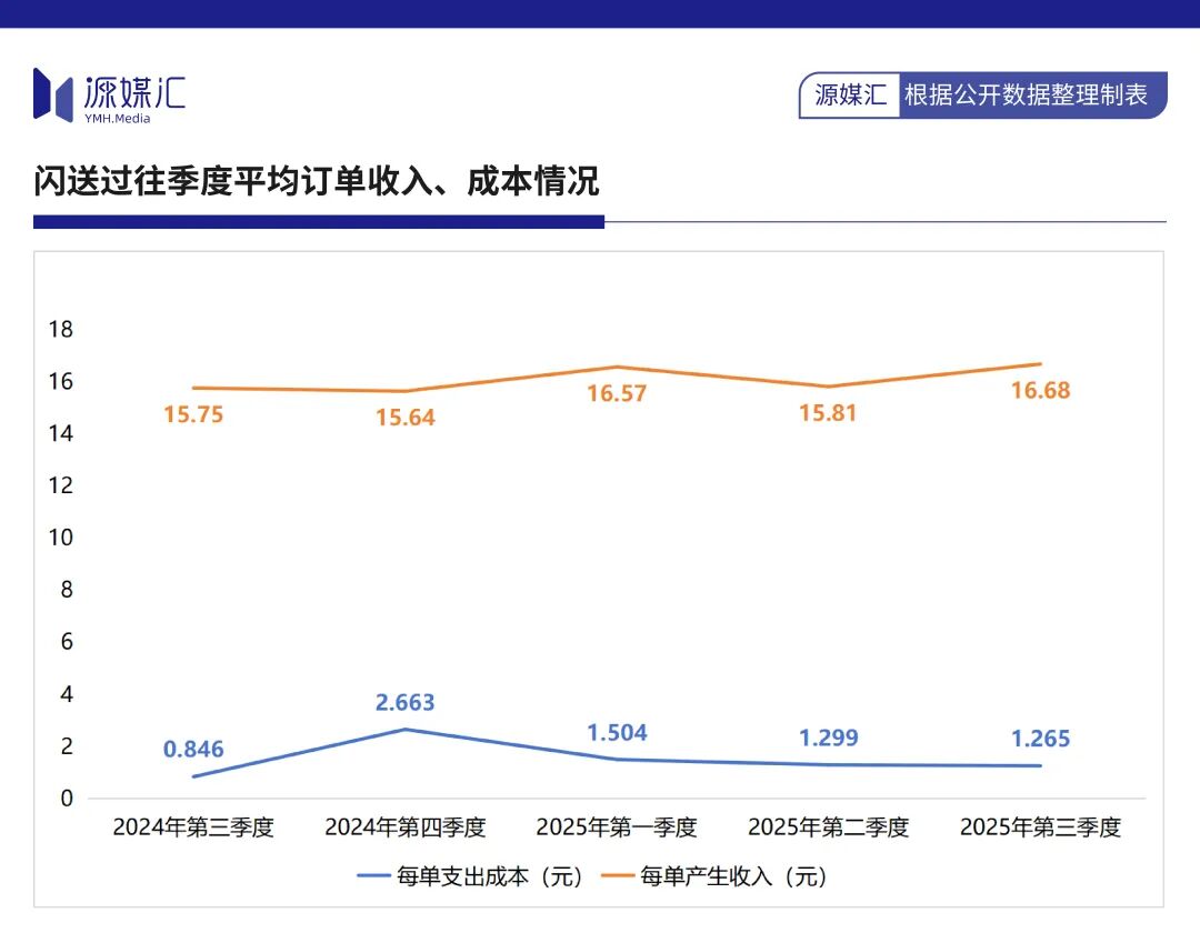 盡管閃送單個季度每筆訂單收入呈現(xiàn)波動向上,但整體處于下滑中——2025年三季度每單產(chǎn)生收入為16.08元,同比減少1.15%。當前,閃送的經(jīng)營狀態(tài)恰恰容易走到其提及的“良性循環(huán)”相反的一面。