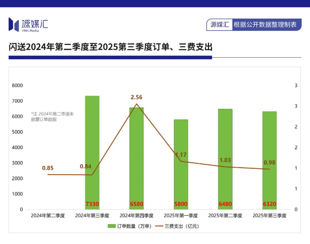 隨著即時零售戰(zhàn)火越燒越旺,閃送的訂單數(shù)量開始呈現(xiàn)下滑趨勢。2024年三季度為7330萬單,2025年三季度為6320萬單,同比減少約13.8%。2025年前三季度,閃送累計完成1.86億單,同比減少12%。