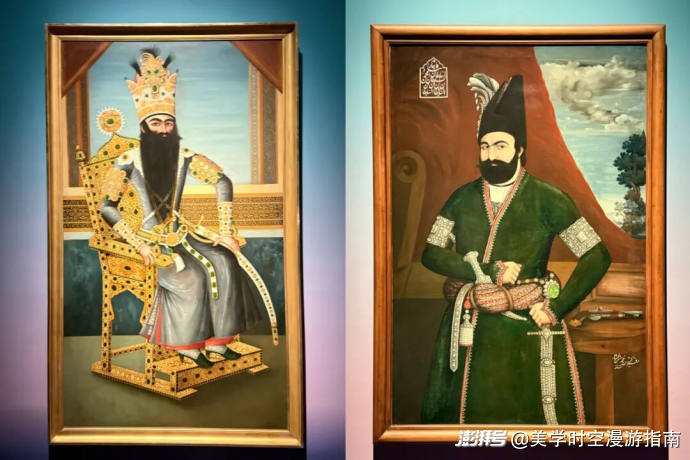 尤其是在這個展廳里,左、右兩側(cè)肖像畫顯示著風(fēng)格轉(zhuǎn)變,從金碧輝煌轉(zhuǎn)向暗色調(diào)、歐式元素(如右圖中桌子、手槍、背景中的風(fēng)景畫),反映歐洲影響與本土主題的平衡。在畫作里,墻上掛件展示阿契美尼德王朝傳統(tǒng);風(fēng)格延續(xù)薩法維時期。
