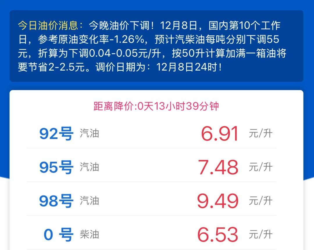 12月8日,國內(nèi)第10個工作日,原油變化率為-1.26%,預(yù)測汽柴油分別上漲260元/噸下調(diào)55元,折算后下調(diào)為0.04-0.05元/升,按50升計算,加滿一箱油將節(jié)省2-2.5元,調(diào)價日期為:12月8日24時(今晚12點)!當前預(yù)測僅供參考,具體油價調(diào)整情況,以國家發(fā)展改革委公布的為準!