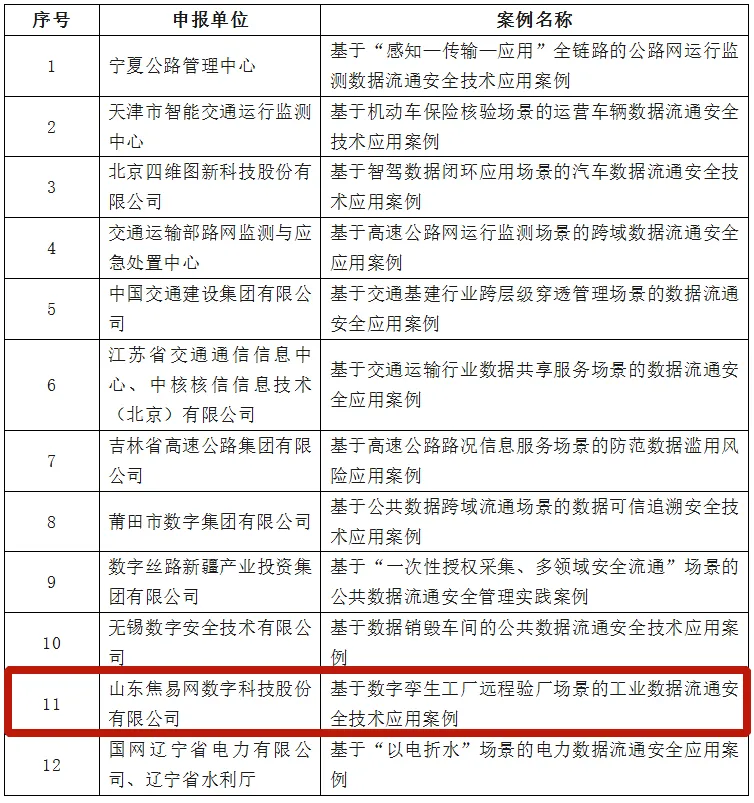 12月4日,國(guó)家數(shù)據(jù)局官方網(wǎng)站發(fā)布了第二批數(shù)據(jù)流通安全治理典型案例名單,全國(guó)共12個(gè)案例入選,我市推薦的山東焦易網(wǎng)數(shù)字科技股份有限公司《基于數(shù)字孿生工廠遠(yuǎn)程驗(yàn)廠場(chǎng)景的工業(yè)數(shù)據(jù)流通安全技術(shù)應(yīng)用案例》成功入選,是山東省唯一入選案例,成為全國(guó)以數(shù)據(jù)安全促進(jìn)數(shù)據(jù)要素流通利用的示范樣本。