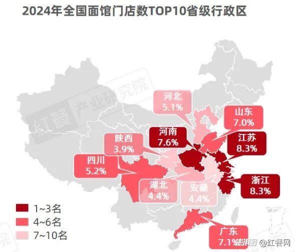 2024年,從區(qū)域分布來看,我國面館門店主要集中在華東一帶,占比達(dá)到35.1%,華中、西南、華南、華北的占比也較高,分別是13.8%、12.7%、12.3%、11.0%。而擁有“掛面第一股”的湖南,至今還沒有跑出有較高知名度的面館品牌。