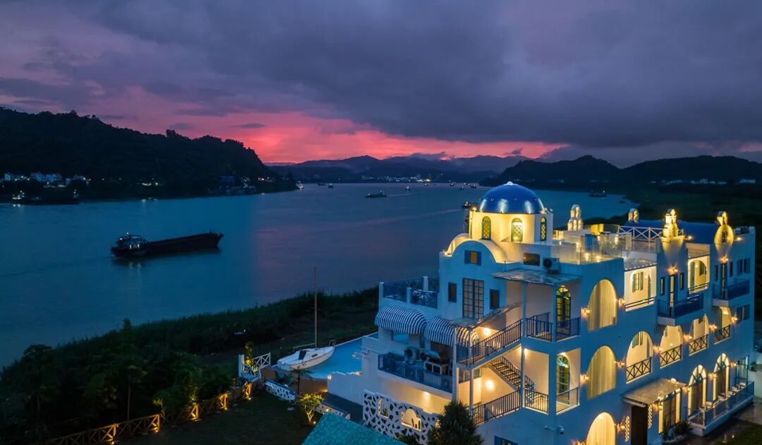 一座藍(lán)白色的異域風(fēng)情建筑臨江而立,