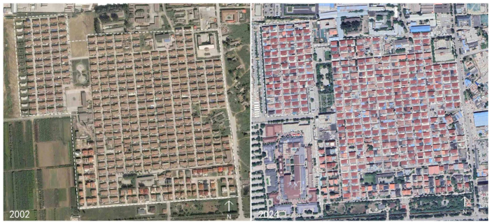 從相關(guān)文獻(xiàn)資料里,我們得知了當(dāng)時(shí)建設(shè)的細(xì)節(jié):“村委會(huì)參考了周邊建成別墅區(qū)的規(guī)劃方式重新規(guī)劃了村落的布局,以期獲得良好風(fēng)貌。重新規(guī)劃布局的村落以南北向道路貫穿,6m和3m的道路交替分布,東西向連接干道的支路均為3m。住宅單元由道路分割形成,每個(gè)單元由東西兩戶住宅組成,一個(gè)單元的尺度為20m×21m,建筑均采用南北朝向的布局。建筑的形制同樣模仿了周邊建成別墅區(qū)的樣式,為兩層的磚混結(jié)構(gòu),占地面積210㎡,建筑面積183㎡,前后分別是進(jìn)深8m和1.5m庭院,南北方向開(kāi)門(mén)” (強(qiáng)毅 et al. , 2024)。