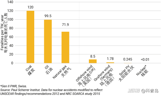 制造每太瓦時(shí)電量(相當(dāng)于全世界大約5個(gè)月的用電量)相關(guān)事故造成的人員死亡人數(shù)
