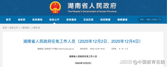 12月9日,湖南省人民政府官網(wǎng)發(fā)布《湖南省人民政府任免工作人員(2025年12月2日)》。其中,蔣昌波同志任長沙理工大學(xué)校長,免去其湖南工業(yè)大學(xué)校長職務(wù)。