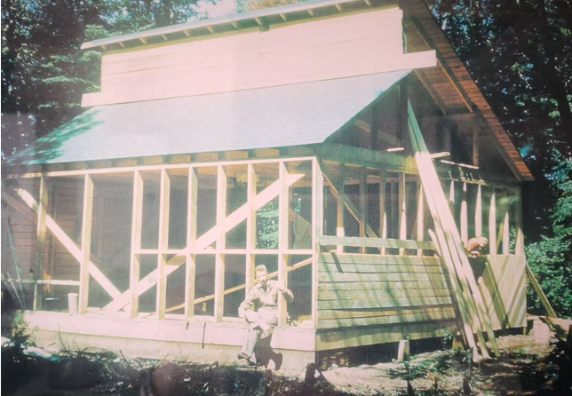 1948年,查理的爺爺坐在蓋了一半的小木屋前