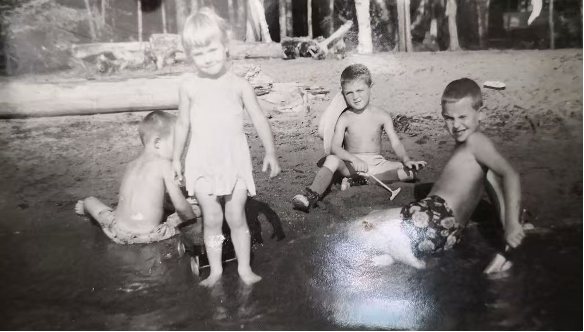背對(duì)著我們的查理爸爸和他的兄弟姐妹,在湖水里玩耍,上個(gè)世紀(jì)的50年代