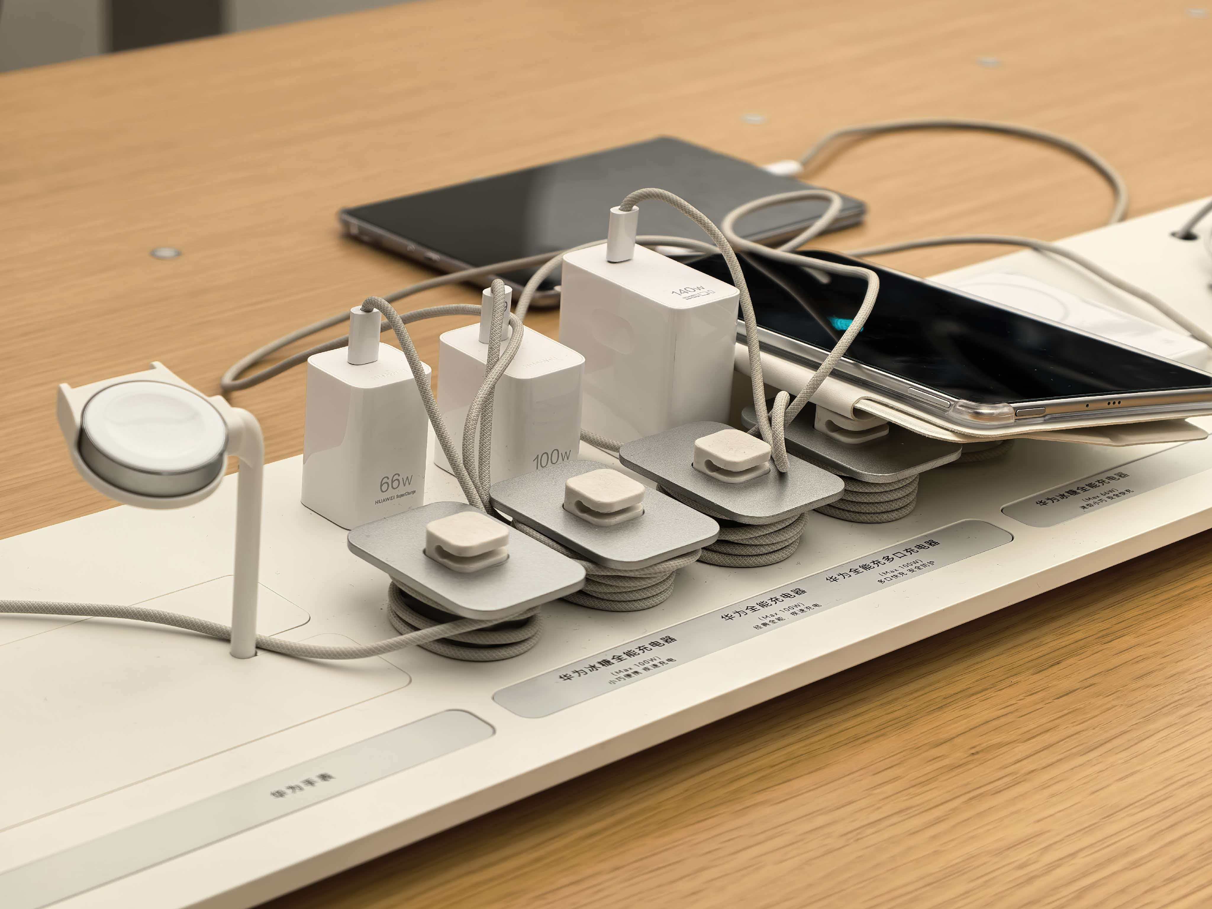 我們進一步詢問資料傳輸、貼膜等服務時,店員也給出非常清晰的說明。貼膜服務并不是免費,按照會員等級一年有固定的次數(shù),用完之后就需要收費,一張99元,其實有一點偏貴,但店員表示到店貼膜的顧客并不算多,花錢貼這種水凝膜的更是少之又少。充電服務做得非常到位不僅可以免費充電,而且提供66W、100W、140W三種規(guī)格的快充充電頭和線,甚至還準備了華為手表的專用充電座,是我們此次走訪中看到配置最齊全充電區(qū)。
