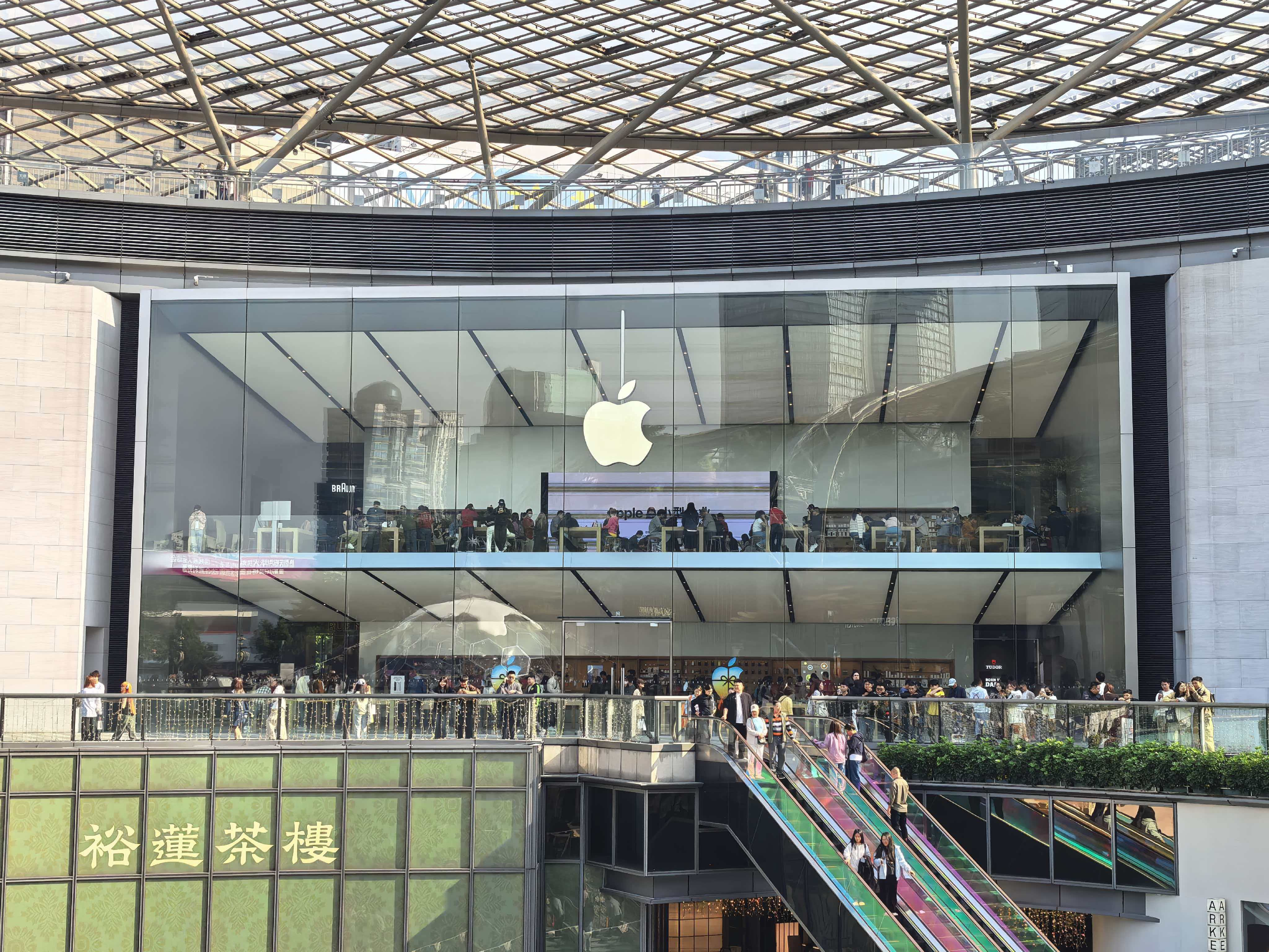 蘋果在廣州的第一家直營店落于天河區(qū)體育西路天環(huán)廣場,由于臨近圣誕節(jié),天環(huán)廣場開放了特殊的節(jié)日裝飾,即使是工作日的中午依然很多路人拍照打卡。同樣地,這樣的熱鬧氛圍也在Apple Store店內呈現(xiàn)。