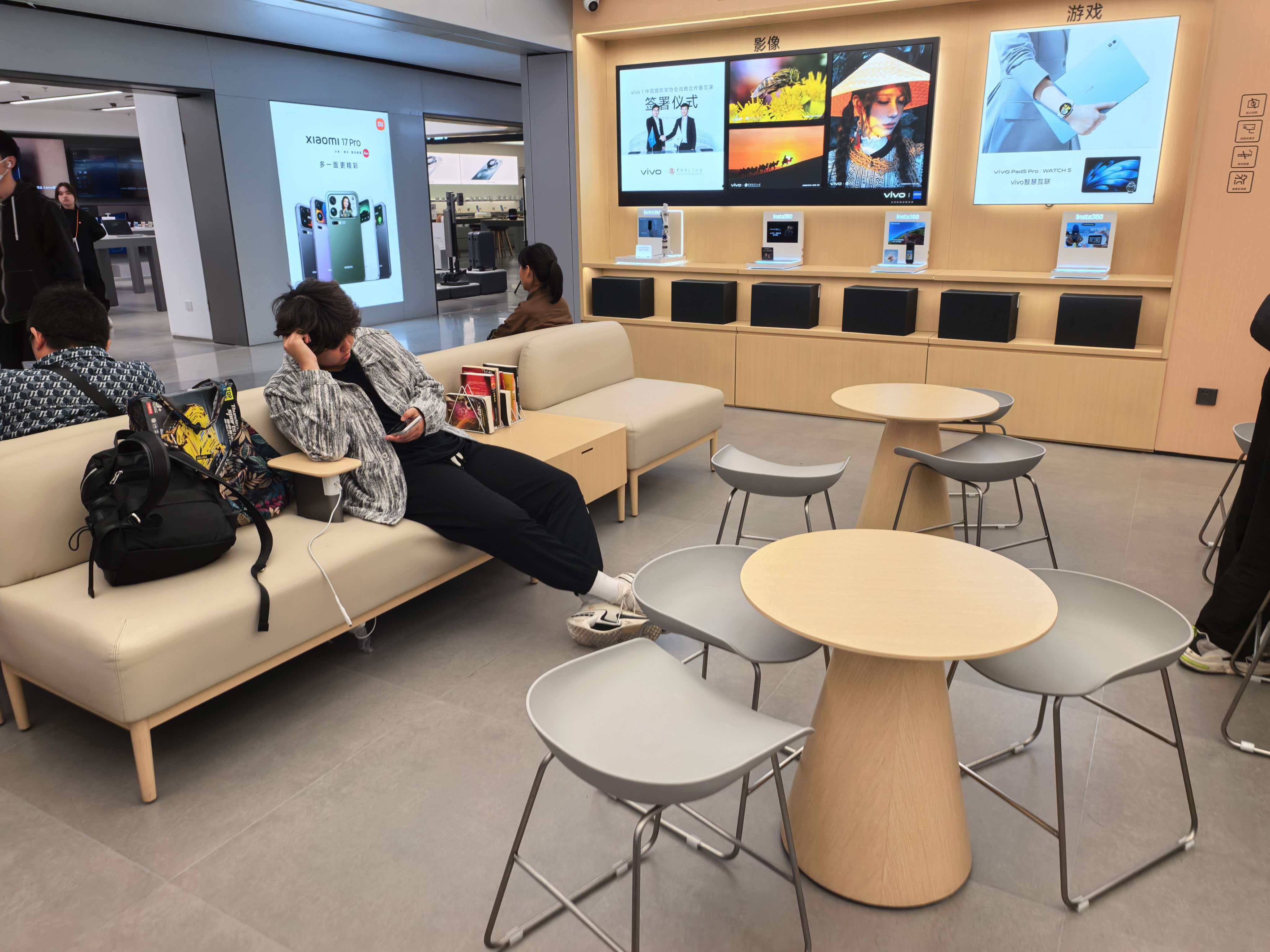 另一旁的桌子上,一位中年女性正在體驗vivo Vision,旁邊的店員耐心為她介紹各個功能。但很可惜的是,當天已經沒有體驗名額了。我們還注意到,vivo門店雖然比較小一些,但除了手機展示區(qū)、售后服務中心,vivo Vision的體驗區(qū)外,還增加了一張長條型沙發(fā),配有插口,所有顧客都可以在這里歇一歇腳,充充電。