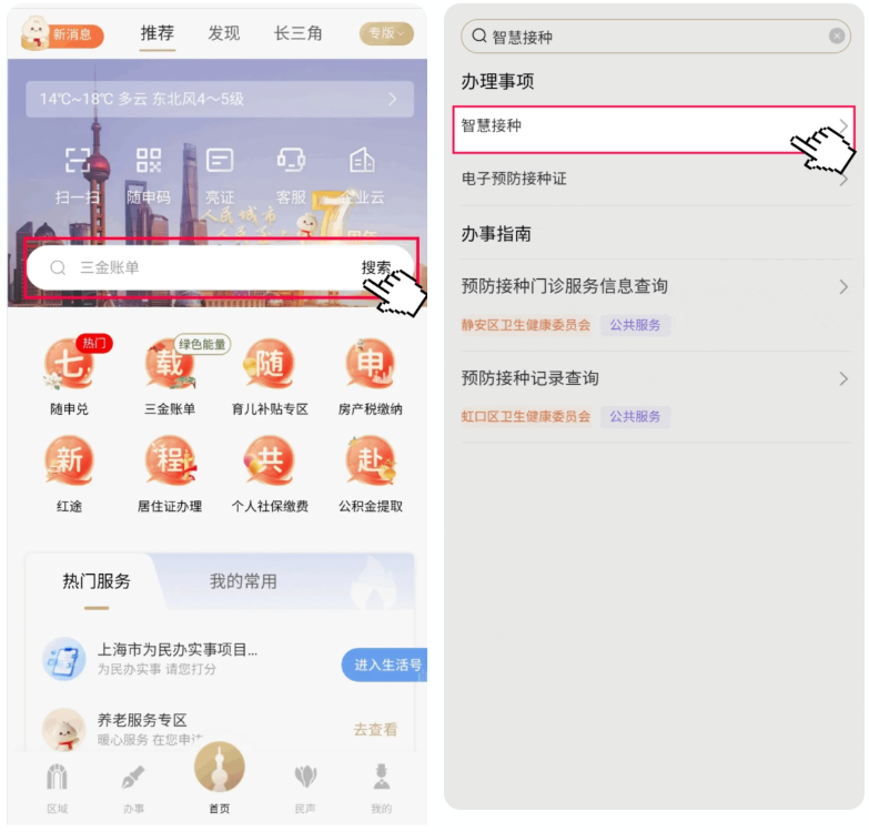 1、家長打開“”隨申辦市民云APP,首頁搜索“智慧接種”,點(diǎn)擊進(jìn)入對應(yīng)服務(wù)。