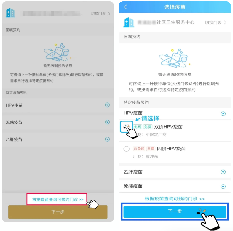 3、支持根據(jù)疫苗查詢可預(yù)約門診。選擇對應(yīng)的門診、HPV疫苗,點(diǎn)擊“下一步”。
