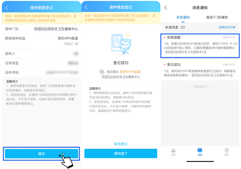 4、完成接種意愿登記,接種門診到苗后,將收到短信及系統(tǒng)通知。