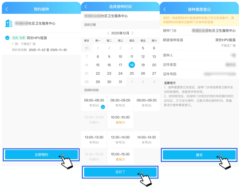 5、進(jìn)行預(yù)約接種,選擇預(yù)約時間并進(jìn)行預(yù)約確認(rèn)。完成預(yù)約后,根據(jù)預(yù)約時間準(zhǔn)時前往醫(yī)院接種疫苗。