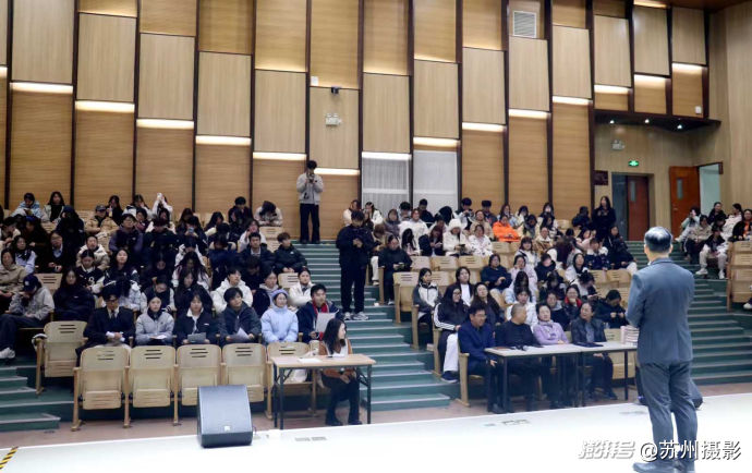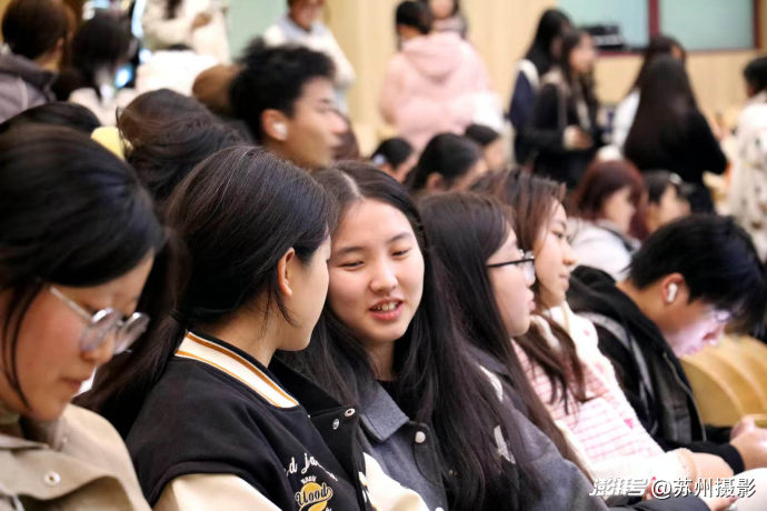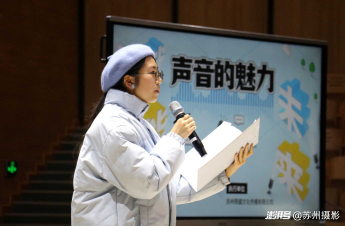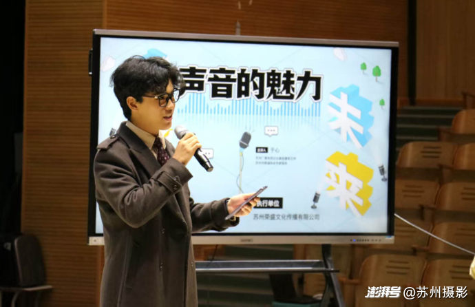 蘇州廣電總臺高級播音主持,蘇州市朗誦協(xié)會專家指導(dǎo)于心老師為現(xiàn)場的200多位同學(xué)作了專題講座,講解了好聲音的標(biāo)尺、如何認(rèn)識自己的聲音、如何給聲音美顏、如何讓聲音更具親和力等關(guān)于魅力聲音形成的基本方法。播音主持專業(yè)的六位同學(xué)上臺做了朗讀示范,于心老師結(jié)合每一篇文稿,進(jìn)行一對一點評,幫助同學(xué)們理解如何以文字內(nèi)涵調(diào)動自身情感,并以語言技巧二度創(chuàng)作,最終準(zhǔn)確傳遞情感的創(chuàng)作過程。同學(xué)在聆聽中理解,聲音和語言的鍛煉將是傳遞思想和情感,賦能未來的重要路徑。