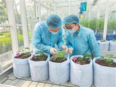 日前,工作人員在隔離圃查看種苗長(zhǎng)勢(shì)。黃媛艷 攝