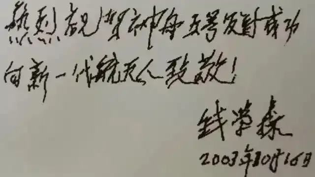 神舟五號(hào)飛船發(fā)射成功后錢學(xué)森親筆題寫賀詞 圖片來(lái)源:“中國(guó)載人航天”公眾號(hào)