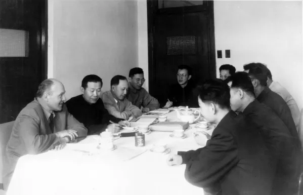 1956年5月,錢學(xué)森(左3)等參加十二年科學(xué)規(guī)劃綜合組會(huì)議 圖片來(lái)源:中國(guó)科學(xué)家博物館