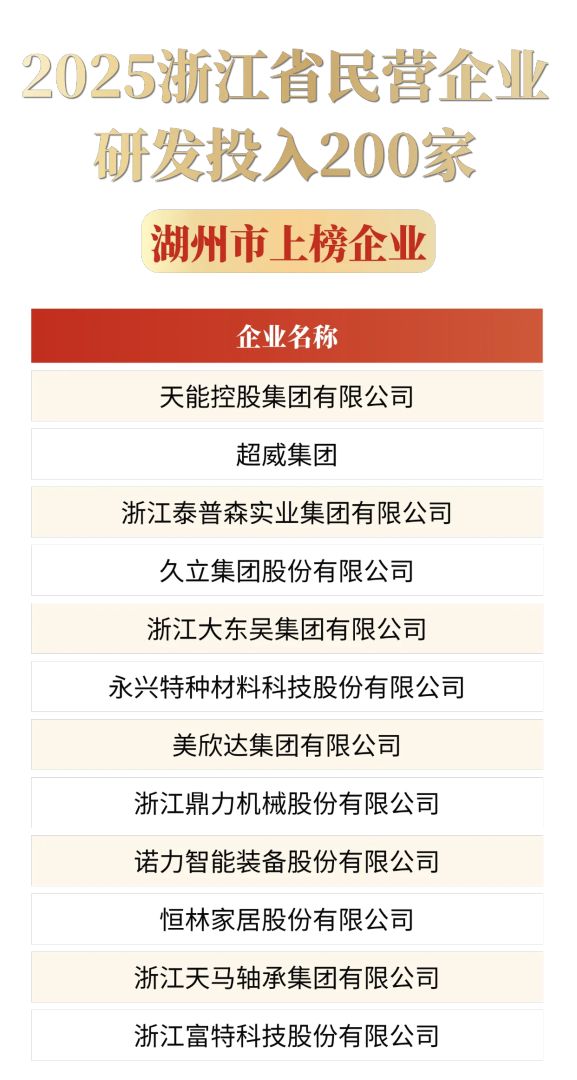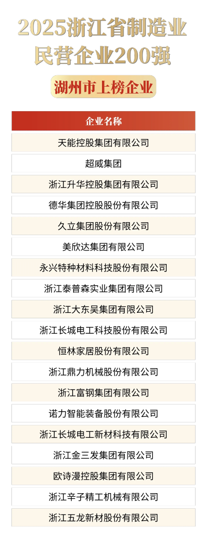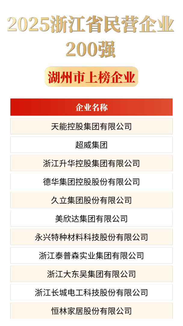 12月5日,省工商聯(lián)、浙商總會(huì)發(fā)布2025浙江省民營企業(yè)200強(qiáng)榜單,湖州有11家企業(yè)位列其中。