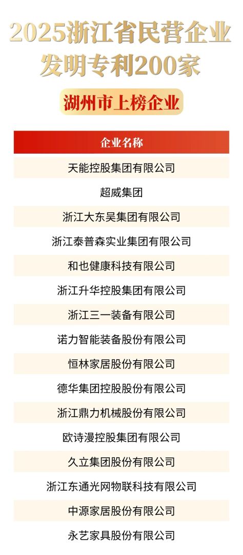 當(dāng)天,2025浙江省制造業(yè)民營企業(yè)200強(qiáng),2025浙江省服務(wù)業(yè)民營企業(yè)100強(qiáng),2025浙江省民營企業(yè)研發(fā)投入200家,2025浙江省民營企業(yè)發(fā)明專利200家等系列榜單一并發(fā)布。湖州也有多家企業(yè)上榜,其中,19家企業(yè)上榜制造業(yè)民營企業(yè)200強(qiáng),2家企業(yè)上榜服務(wù)業(yè)民營企業(yè)100強(qiáng),12家企業(yè)上榜民營企業(yè)研發(fā)投入200家,16家企業(yè)上榜民營企業(yè)發(fā)明專利200家。