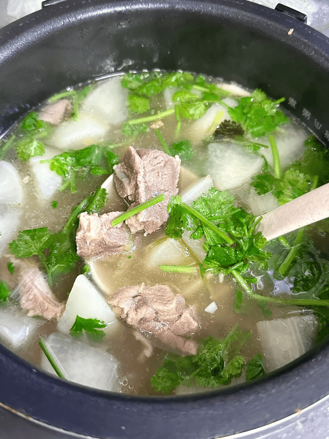 一個(gè)半小時(shí)后揭開砂鍋蓋,羊肉的香氣撲面而來,肉質(zhì)已變得軟爛。此時(shí),加入腌好的蘿卜塊,繼續(xù)小火慢燉二十分鐘。蘿卜在湯中漸漸變得半透明,燉夠火候的湯汁,原本寡淡的清甜變得醇厚綿長。最后,加入適量鹽調(diào)味,撒上一把翠綠的香菜段,關(guān)火后燜五分鐘,讓香氣充分融合。