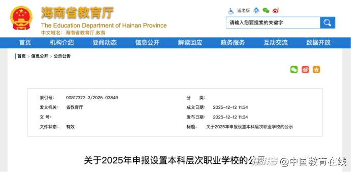 12月12日,海南省教育廳發(fā)布《關(guān)于2025年申報設(shè)置本科層次職業(yè)學校的公示》。