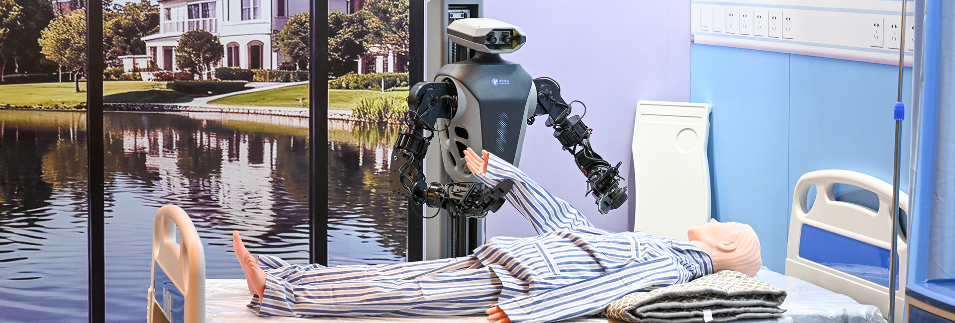 在醫(yī)療康養(yǎng)競(jìng)技場(chǎng),機(jī)器人模擬家庭病房環(huán)境,需要自主完成三項(xiàng)核心任務(wù):一是交互照護(hù)(物品遞送);二是護(hù)理床姿態(tài)調(diào)整;三是床邊肢體康復(fù)訓(xùn)練。這個(gè)比賽考察多模態(tài)感知(視覺(jué)、語(yǔ)音)、物體識(shí)別與抓取、精細(xì)力控操作、護(hù)理床控制、康復(fù)軌跡規(guī)劃、人機(jī)安全交互。