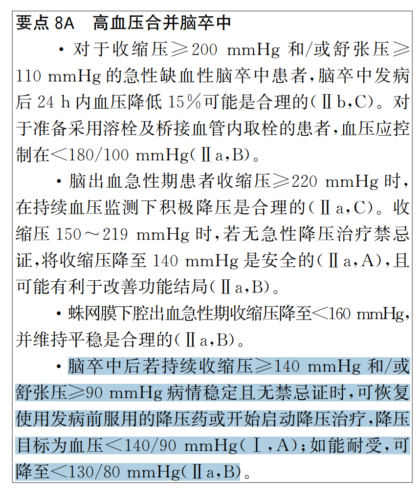 在這部指南中,對(duì)于腦?;颊叩难獕嚎刂平o出了明確的說法(如下表。其內(nèi)容太專業(yè),其中的“腦卒中”是指腦梗死和腦出血)。請(qǐng)非專業(yè)人士重點(diǎn)看該表中的最后一句話(我涂黑的部分)——