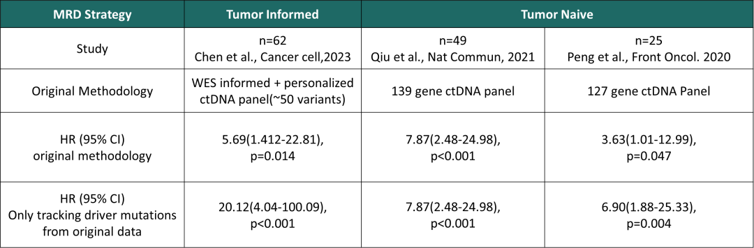 圖3. 三項(xiàng)術(shù)后MRD研究中驅(qū)動(dòng)突變患者數(shù)據(jù)二次分析結(jié)果