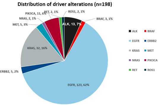 DRIVE 為前瞻性觀察性多中心研究,由上海市胸科醫(yī)院陸舜教授牽頭,全國(guó) 14 家中心共同參與。研究入組 2022–2025 年間腫瘤組織確認(rèn)攜帶至少 1 個(gè)驅(qū)動(dòng)突變(EGFR、ALK、ROS1、KRAS、BRAF、MET、RET、HER2、NRAS、PIK3CA),且未接受系統(tǒng)性抗腫瘤治療的可手術(shù) III 期 NSCLC 患者;在最終篩選的 198 例患者中,EGFR 突變占 62%(123/198),KRAS 突變占 16%(32/198),ALK 突變占 7%(13/198)。研究在治療前、根治術(shù)后或內(nèi)科治療后及隨訪過(guò)程中采集外周血樣本并開(kāi)展 ctDNA 檢測(cè),以評(píng)估聚焦驅(qū)動(dòng)突變的 MRD 策略在術(shù)后復(fù)發(fā)風(fēng)險(xiǎn)監(jiān)測(cè)與全病程管理中的價(jià)值。