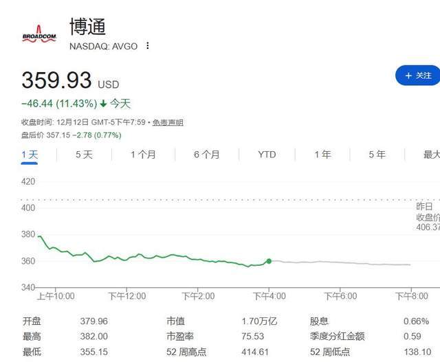 2025年12月12日16點(diǎn)03分,納斯達(dá)克交易大廳的電子屏突然泛起紅光。博通(AVGO.US)的股價(jià)在連續(xù)30分鐘的拋售潮中直線下墜,從開盤402美元跌至357美元,單日跌幅最終定格在11.2%,市值蒸發(fā)超1200億美元——這是該公司自2020年3月疫情熔斷以來最慘烈的單日跌幅。