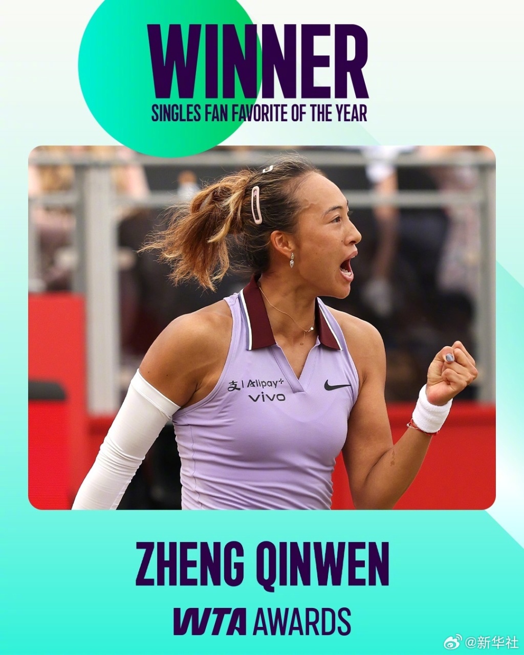 據(jù)@WTA國(guó)際女子網(wǎng)球協(xié)會(huì) ,中國(guó)網(wǎng)球運(yùn)動(dòng)員鄭欽文連續(xù)兩年當(dāng)選WTA年度最受歡迎單打球員!祝賀! ???