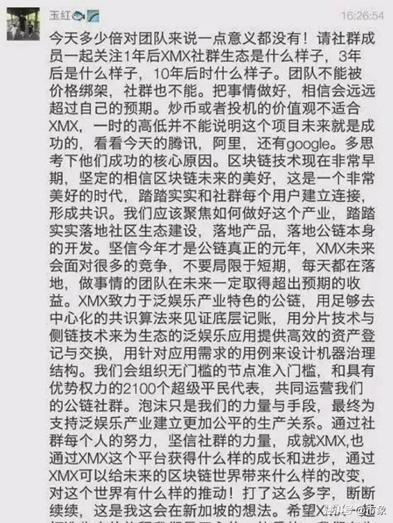 玉紅的營銷方式也十分低劣——他設(shè)立的XMX幣沒有技術(shù)白皮書,沒有任何技術(shù)壁壘,只有社群營銷。玉紅會讓幾百個社區(qū)的群員,在同一天換上統(tǒng)一頭像,將昵稱統(tǒng)一改成“我是XMX,我是三點(diǎn)鐘創(chuàng)始人玉紅,我是全球第一社群公鏈”,營造出聲勢浩蕩的陣仗引誘散戶入場。