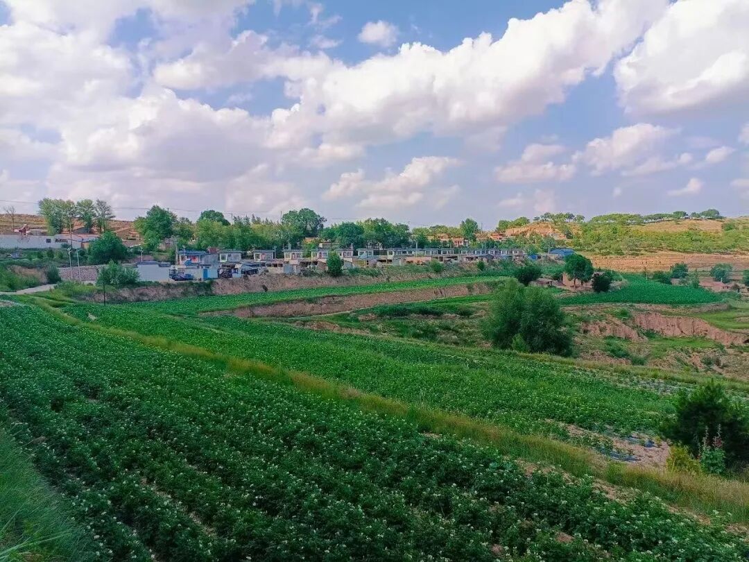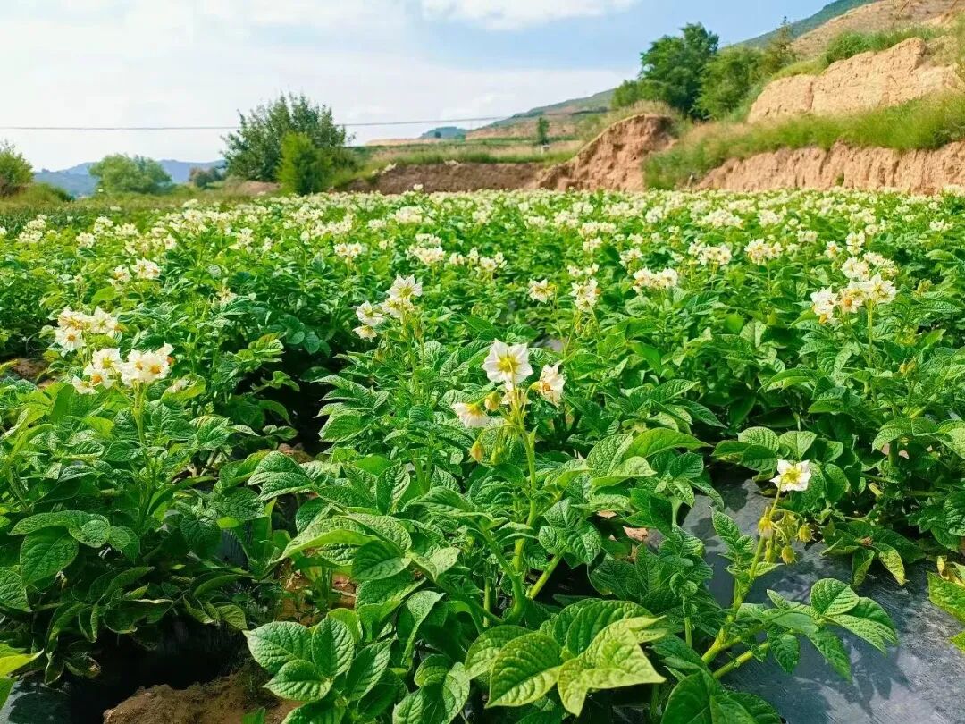 正說著,轉(zhuǎn)過一個山彎,眼前豁然開朗。那是一片極大的緩坡,一層一層的梯田,從我們的腳下,一直鋪排到對面山梁的跟前。田里滿是洋芋的秧子,葉子是墨綠墨綠的,肥厚油亮,一片挨著一片,密密匝匝,在晨光里泛著一層潤澤的光,仿佛把整個旱塬上蓄積的、珍貴的濕氣,都凝在了這一片蓬勃的綠意里。而在這無邊的綠毯之上,這里那里,正浮起一片片朦朧的、淡淡的紫白色的煙霞——那便是洋芋花了。