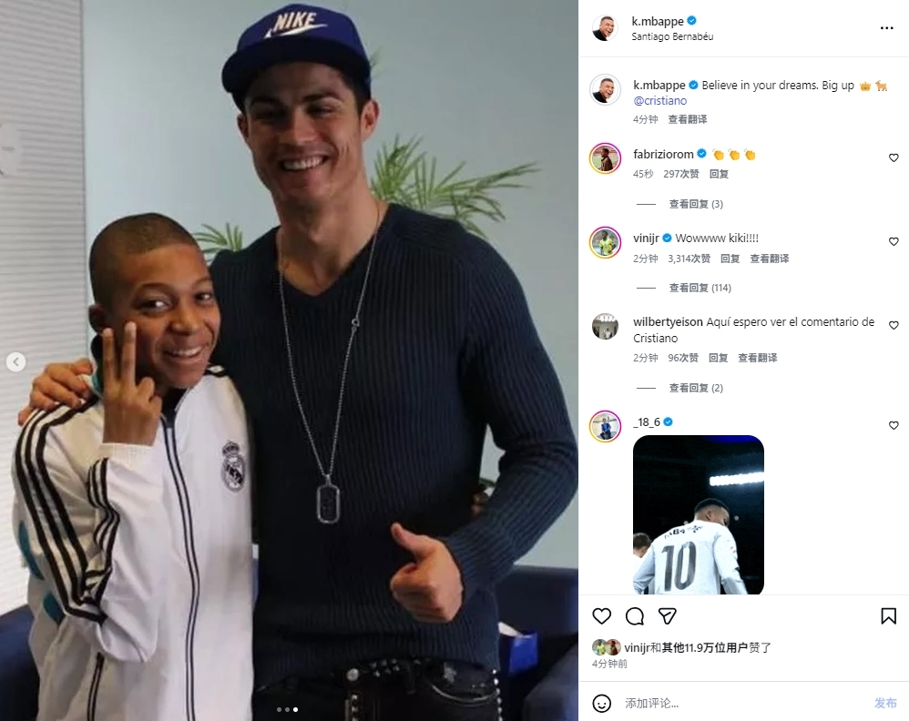 賽后,姆巴佩更新社媒,發(fā)布了本場比賽自己進(jìn)球后模仿C羅慶祝的圖片和自己少年時與C羅的合影,并配文道:“相信你的夢想。致敬王者。”