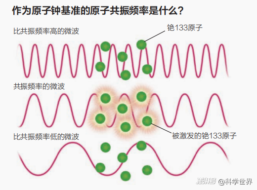 用特有頻率的電磁波照射銫133原子,銫133就會(huì)吸收能量變成激發(fā)態(tài)(中圖)。如果頻率發(fā)生偏移,銫133不會(huì)吸收能量,不能達(dá)到激發(fā)態(tài)(上圖和下圖)。