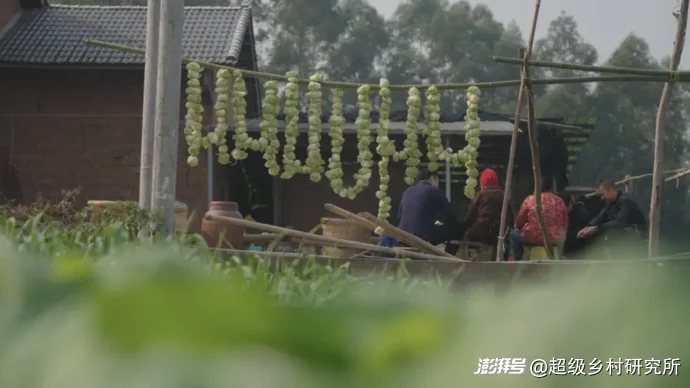 更神奇的是涪陵獨有的“風(fēng)脫水”工序。青菜頭收獲季,當(dāng)?shù)囟嚓幥缟儆甑奶鞖猓宿r(nóng)們將青菜頭串成“菜龍”,懸掛于長江兩岸,借助獨特的氣候,讓江風(fēng)帶走60%的水分。這種自然脫水方式既避免了長時間日曬導(dǎo)致的“燒架”變質(zhì),又不會像大風(fēng)天氣那樣讓菜體干硬,最終形成顏色鮮亮、質(zhì)地嫩脆的原料。