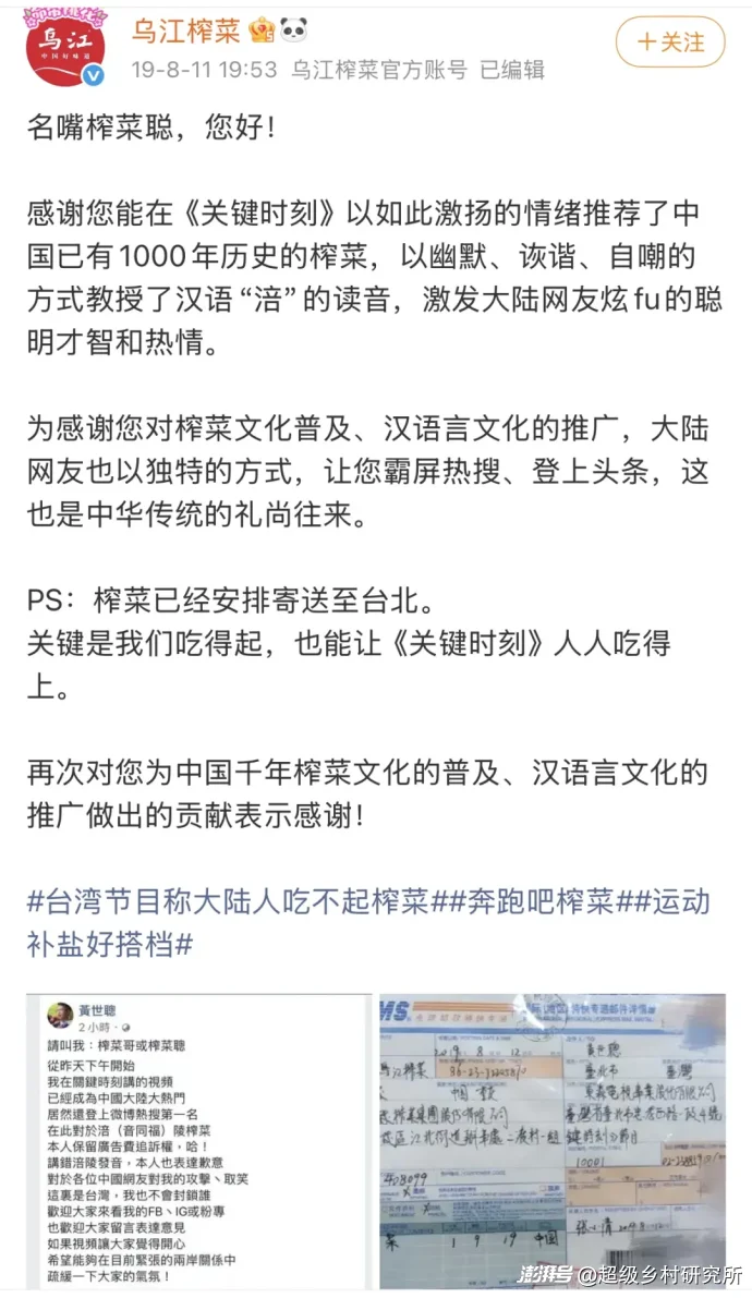 網(wǎng)友們紛紛開啟“榨菜炫富大賽”,曬出榨菜配粥、榨菜炒肉、甚至滿桌榨菜的照片,烏江涪陵榨菜更是直接寄去兩箱榨菜“實力打臉”,讓這個?;鸨閮砂?。