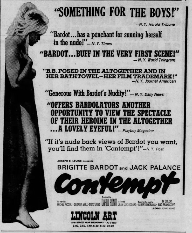 在《上帝創(chuàng)造女人》之后,整個(gè)上世紀(jì)六十年代,她又連續(xù)出演了多部類似的作品,很快就成了法國片酬最高的女演員。1963年,她在新浪潮名導(dǎo)戈達(dá)爾的《蔑視》中,飾演女一號(hào)。用她來演這個(gè)角色,并非導(dǎo)演本意,而是制片方意在拉動(dòng)人氣。全片所有制作預(yù)算有將近一半,都花在了芭鐸的片酬上。而且,該片在美國上映時(shí),宣傳海報(bào)上壓根看不到導(dǎo)演戈達(dá)爾的名字,取而代之的是摘錄自小報(bào)媒體的各種關(guān)于芭鐸裸戲的評(píng)論文字。結(jié)果,這些煽動(dòng)也確實(shí)起到了效果,《蔑視》成了戈達(dá)爾電影生涯中票房最好的一部作品。平時(shí)不愛看歐洲文藝片的年輕觀眾,也都擠進(jìn)影院,只為一睹“性感小貓”的風(fēng)采。