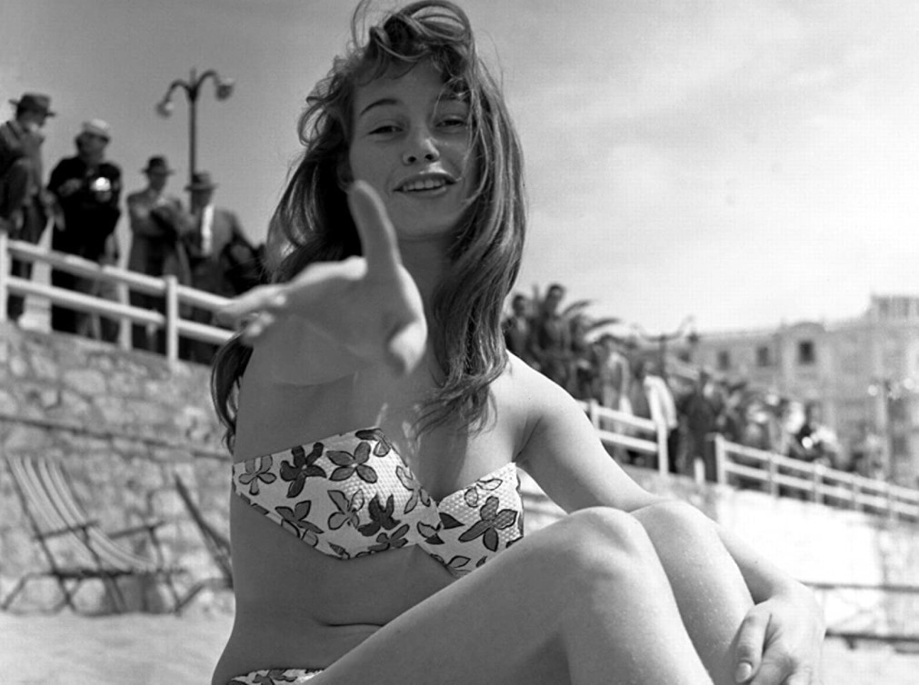 說起來,這部電影問世之際,距離別稱“三點(diǎn)式”的現(xiàn)代比基尼泳衣的誕生不過才六七年。在1951年舉行的“世界小姐”大賽上,這款新式泳衣被用于參賽者的著裝,結(jié)果招致梵蒂岡教宗公開批評(píng)。當(dāng)時(shí)的西方社會(huì),主流民意尚無法接受如此大膽的設(shè)計(jì),《比基尼女郎》上映時(shí)引發(fā)的騷動(dòng)也就可想而知了。不過,特立獨(dú)行的芭鐸對(duì)此毫不在意。1953年4月舉行的法國戛納電影節(jié)上,她和瓦迪姆攜手到場(chǎng),在沙灘上繼續(xù)大秀比基尼穿著,成了媒體關(guān)注的焦點(diǎn)。