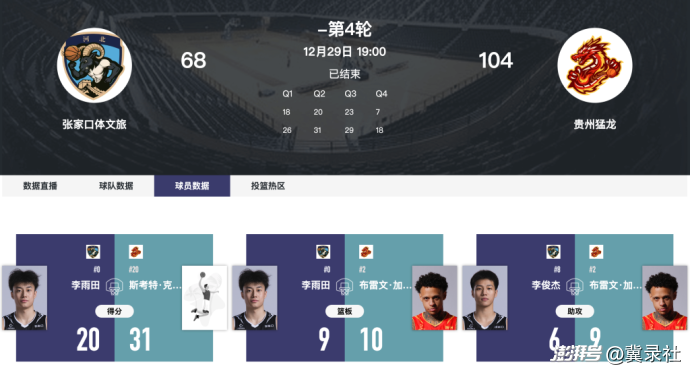 12月29日19:00,NBL常規(guī)賽第4輪,張家口體文旅坐鎮(zhèn)主場(chǎng)迎戰(zhàn)貴州猛龍,最終以68-104不敵對(duì)手,無緣本輪勝利。